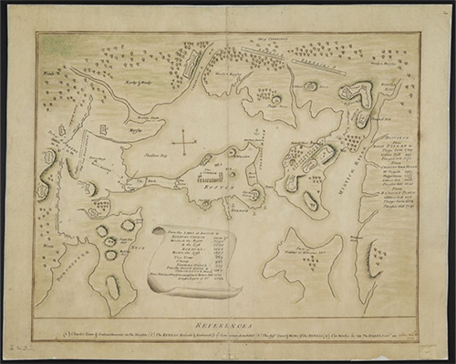 Citation: Manuscript map of the Boston Harbor, 1775, Pen and ink by Jeremy Belknap, Massachusetts Historical Society, https://www.masshist.org/database/1713.